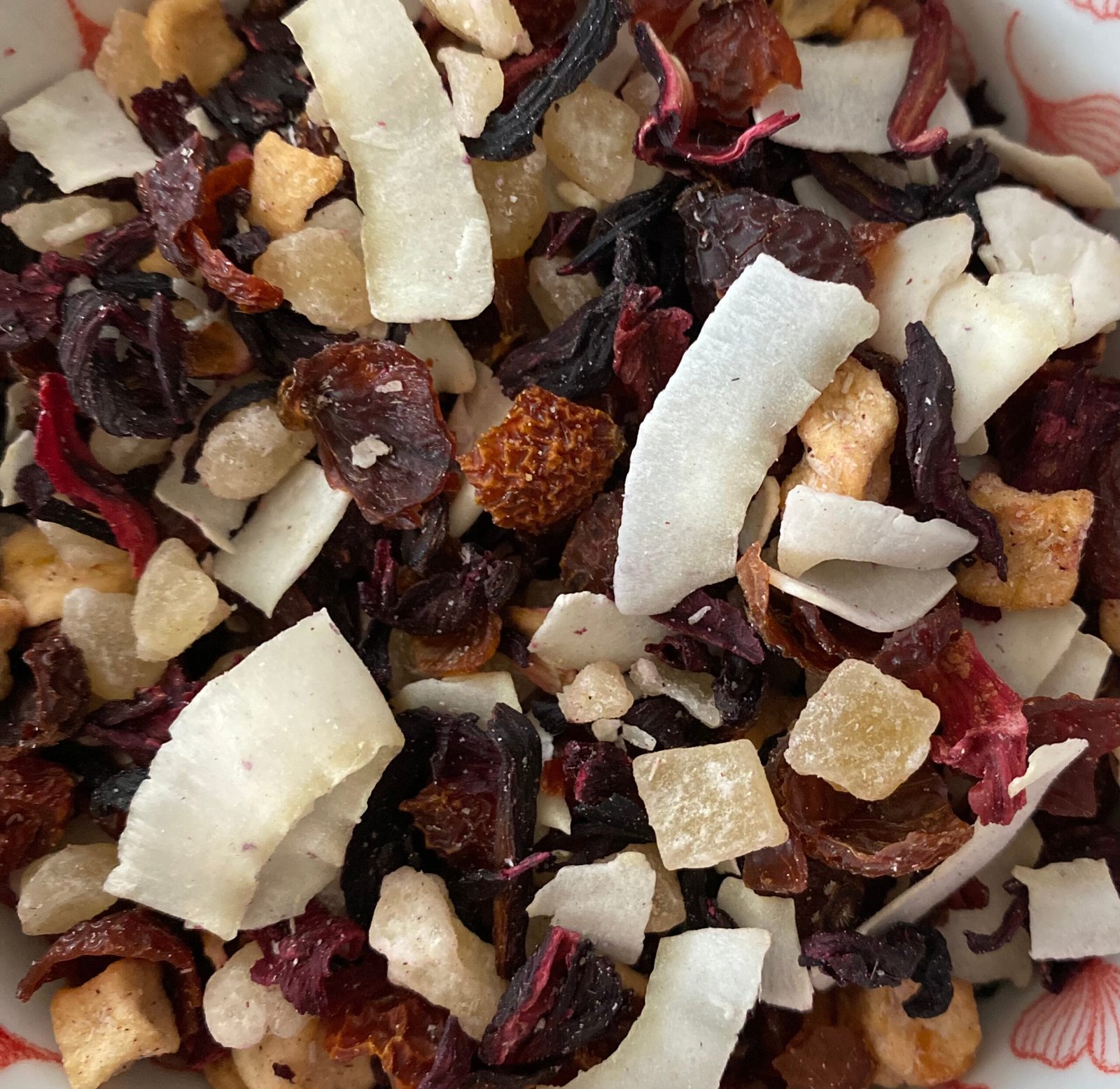 Notre Infusion Pina Colada est élaborée avec des ingrédients de qualité, soigneusement sélectionnés pour leur synergie de saveurs et de bienfaits :