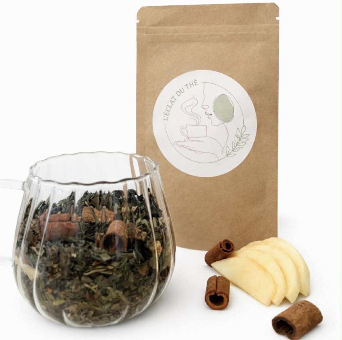 - Le mariage du thé blanc Pai Mu Tan, du thé vert sencha, de la cannelle et de la pomme crée une symphonie de saveurs unique et équilibrée.